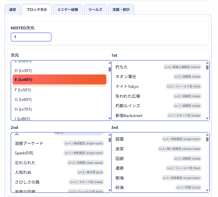 最初は「通常」タブの「A世界」にある「初心者の森」(推奨レベル1)から始まるため、誰でも安心して基本を学べます。ゲームに慣れてきたら、ぜひ「ブロック次元」のランダム選択で、未知の世界に挑戦してみてください!