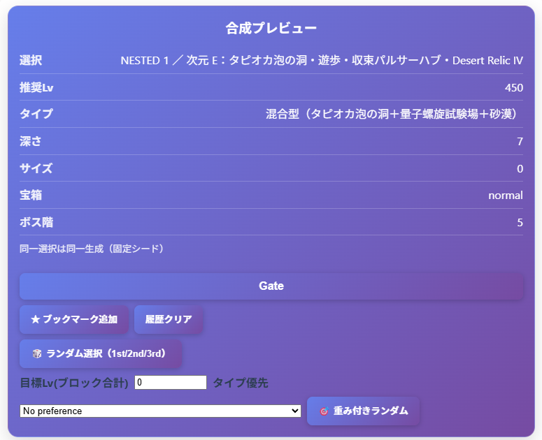 「ブロック次元」は、3つの「ブロック」を組み合わせて自分だけのダンジョンを生成するモードです。最初は難しく感じるかもしれませんが、まずは「ランダム選択」ボタンを押すだけでOKです! ボタンを押すたびに、全く違う世界のプレビューが表示されるのを楽しむだけでも面白いですよ。